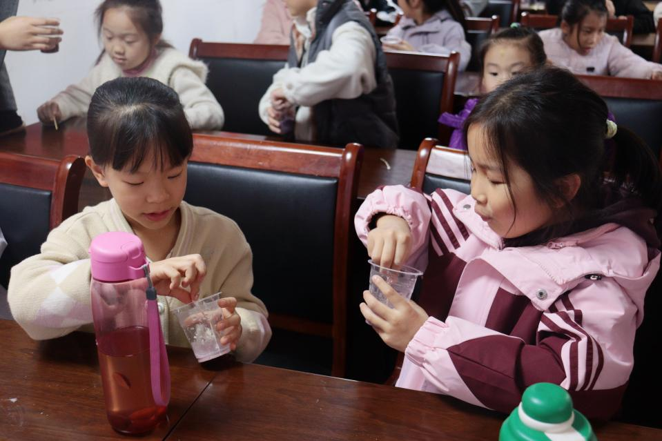 “哇!我的水变蓝了!”“我的也是!”——在“淀粉遇碘变色”实验环节,小朋友们纷纷化身“小小化学家”,瞪大眼睛观察杯中液体从乳白变为深蓝的神奇瞬间。紧接着的“维生素C还原”实验更是引来阵阵惊呼:原本深蓝色的液体,在滴入几滴透明维生素C溶液后,竟像被施了魔法般渐渐褪色、恢复清澈。