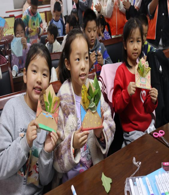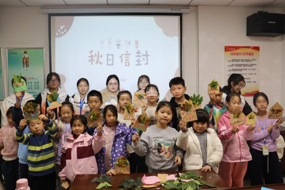 温情未散,创意接力。志愿者们带领孩子们用彩纸、银杏叶、枫叶制作“秋日信封”。