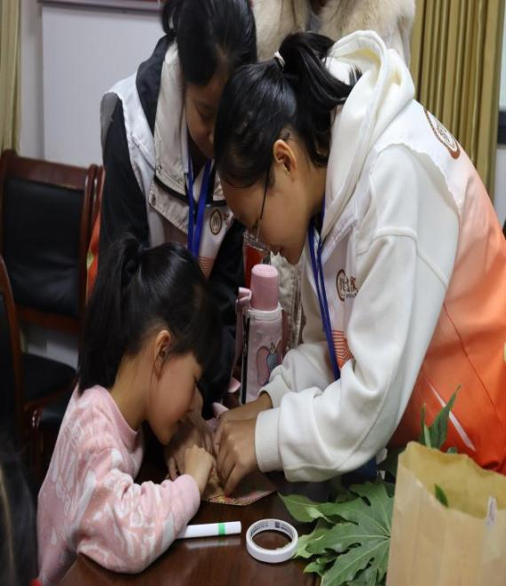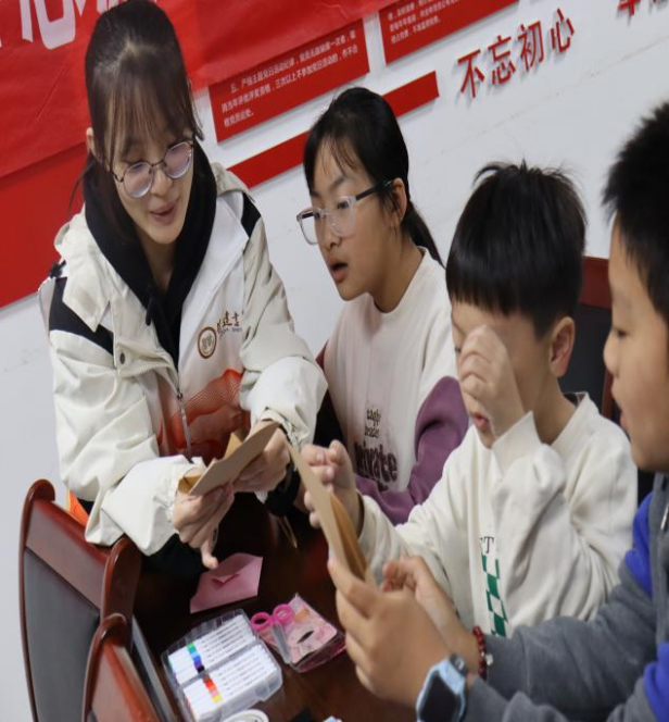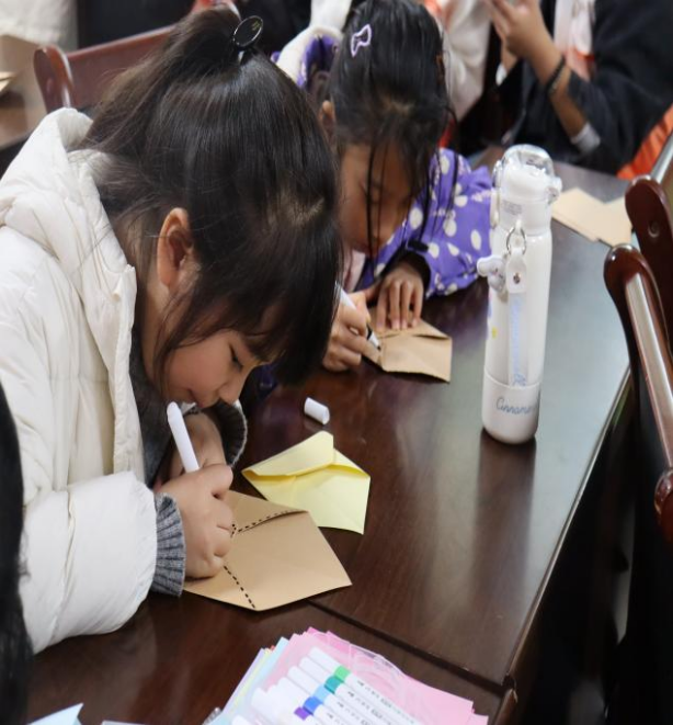 剪刀咔嚓、彩笔沙沙,小朋友们纷纷妆点着自己的特制信封,一位小男孩完成后率先将信封高高举起:“我要把它送给环卫工人李奶奶,感谢她每天清晨将街道打扫的这么干净!”志愿者们一边指导折叠,一边为孩子们贴上红星贴纸,现场其乐融融。