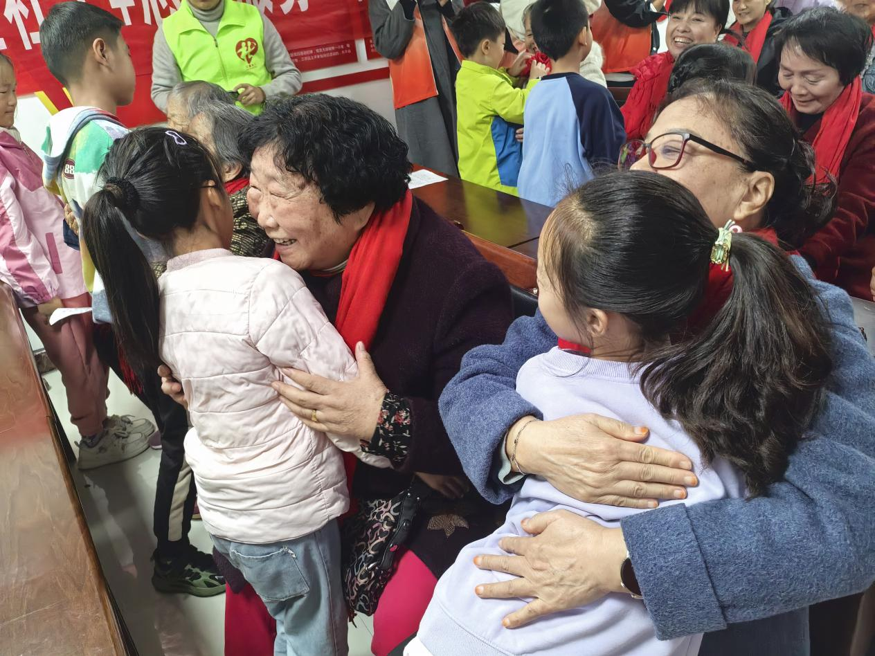活动尾声,老人和孩子们共唱《学习雷锋好榜样》。志愿者带领大家以拍桌击节,稚嫩的童声与苍劲有力的歌声相互交织成最动听的节日合唱。孩子们把做好的信封亲手送给现场老人,再次鞠躬祝福,老人们则把象征长寿的重阳糕回赠孩子,一送一回间,敬老与向善悄然“双向奔赴”。