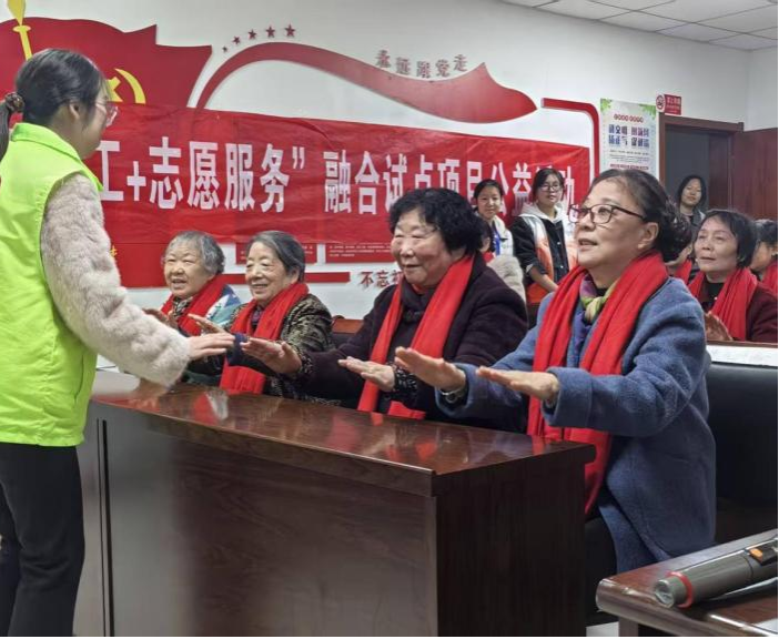 上午九点,活动在蓝湾社区养老服务中心准时开启。主持人先代表实践团成员向老人们送上节日问候,随后社区小朋友们踏拍而歌,手势舞《谢谢你》稚嫩却真挚,瞬间暖热全场。曲毕,孩子们捧起红围巾,踮脚为爷爷奶奶系上:“祝您每天都像今天一样开心!”83岁的王奶奶把献围巾的小志愿者搂进怀里笑言:“这孩子嘴甜,围巾也暖,都暖到我心坎里了!”