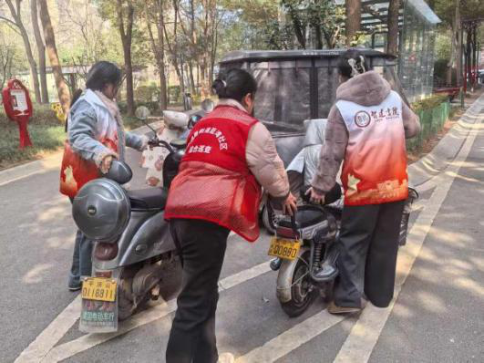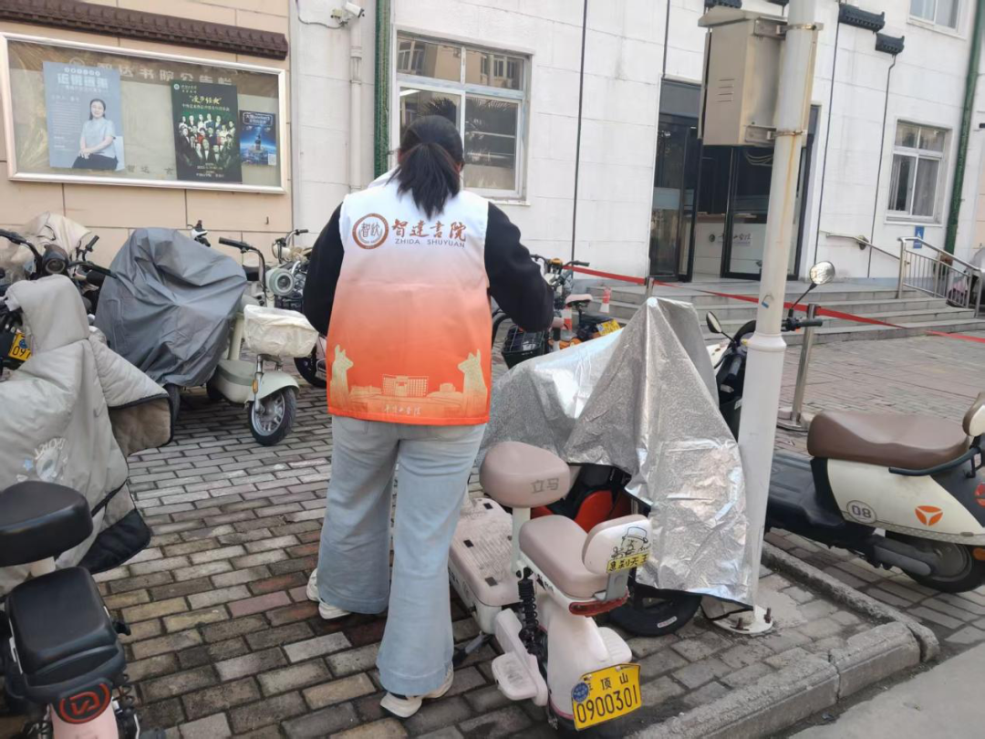 另一组同学则担任“秩序协管员”,重点整治了书院门前的非机动车停放问题。他们将随意停放的电动车一一挪动,按照“整齐、规范、有序”的原则重新摆放。转眼间,原本略显凌乱的门前区域便焕然一新,通道也变得宽敞明亮。