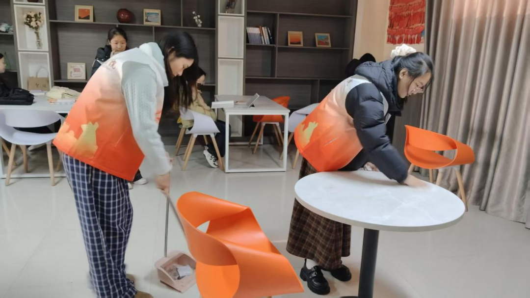 一组同学化身“细节管家”,对书院大厅、办公室、功能厅、微讲堂等区域进行了全方位清洁。他们细心擦拭每一张桌椅、每一扇门窗,清理公共设施和角落积尘,不放过任何一个卫生死角。