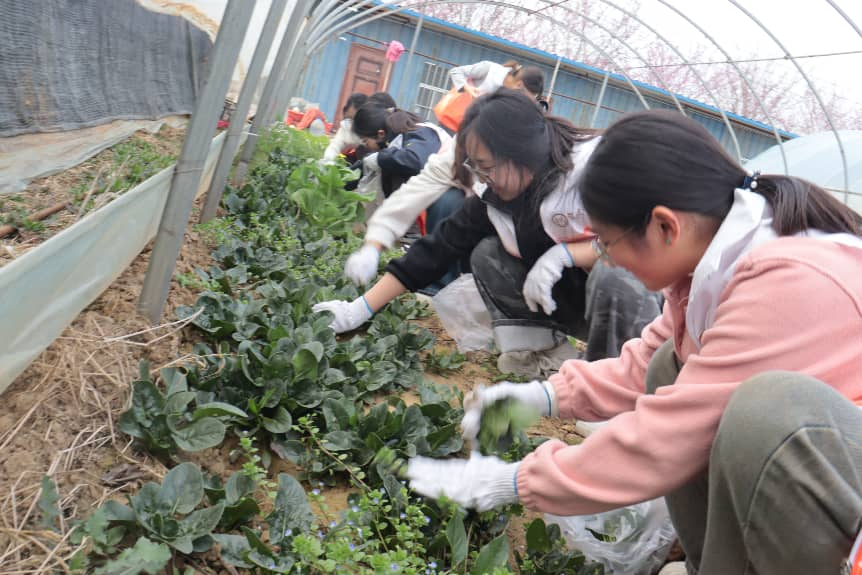另一组同学躬身进入蔬菜大棚,她们的任务是收割鲜嫩的“趴地菠菜”。同学们蹲下身,指尖探入湿润的泥土,小心地将一棵棵叶片肥厚的菠菜连根拔起,再轻抖根须,码放整齐。从生疏到熟练,指尖很快便染上了泥土与菜汁混合的、独属于春天的清气。