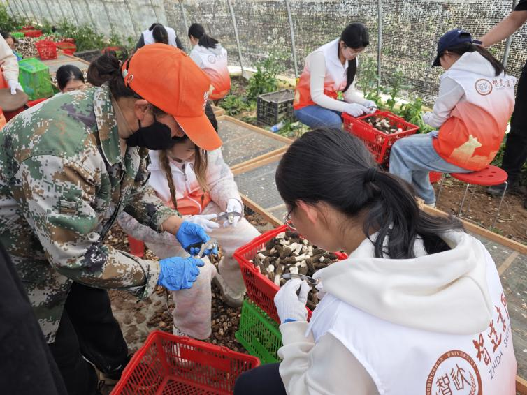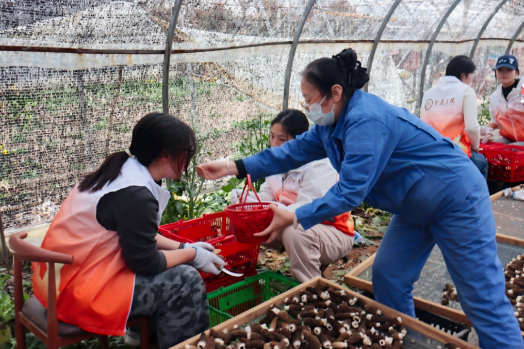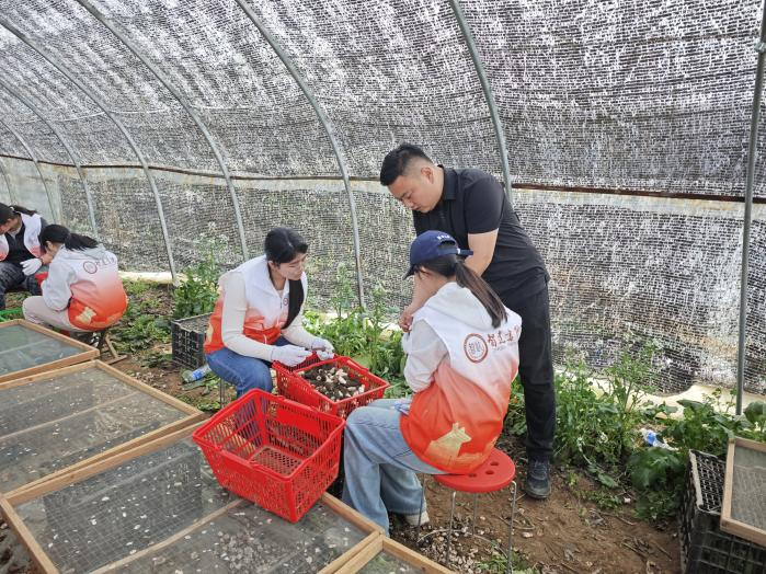 田间地头,就是实践课堂。在当地农户与农技人员的指导下,同学们分为两组,一组来到了羊肚菌种植棚。在农技员的详细讲解下,她们认真学习了这种珍贵食用菌的生长习性、温湿度要求等知识,随后便轻轻托起一朵朵珍贵的羊肚菌,精准地将根部沾染泥土的部分割去,将刚学到的知识化为轻柔的清理与养护动作。