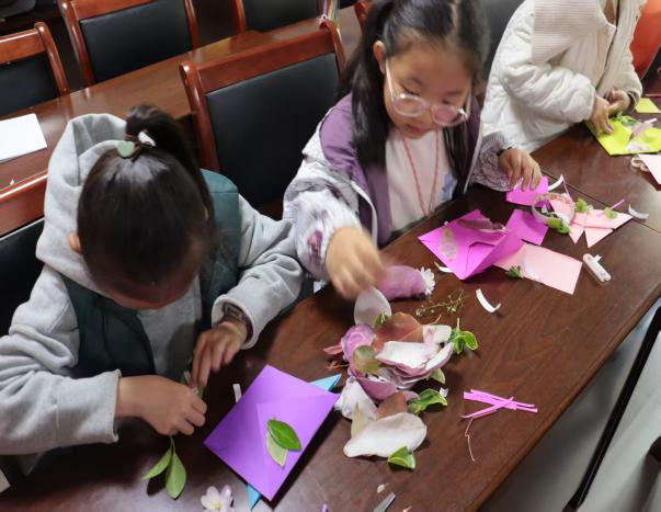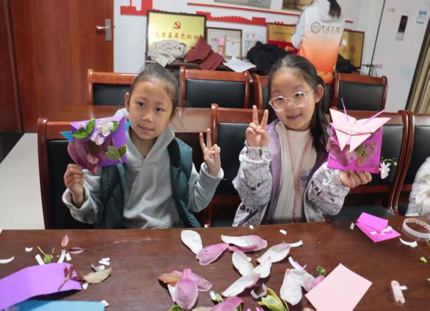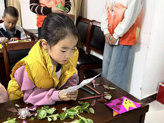 “咔嚓咔嚓”,剪刀翻飞间,枯叶化作金鱼尾巴,花瓣变成蝴蝶翅膀。小朋友们全神贯注、兴致勃勃,紧跟志愿者的指导,小心翼翼地对折卡纸、粘贴封口,耐心完成信封基础造型。志愿者们俯身耐心指导,小伙伴们也互相帮忙、分享技巧,现场氛围融洽又温馨。孩子们尽情发挥创意,将折纸蝴蝶精心贴于信封,再把捡拾的落花落叶巧妙拼接粘贴,让每一个信封都独具特色,满载童真与春日气息。