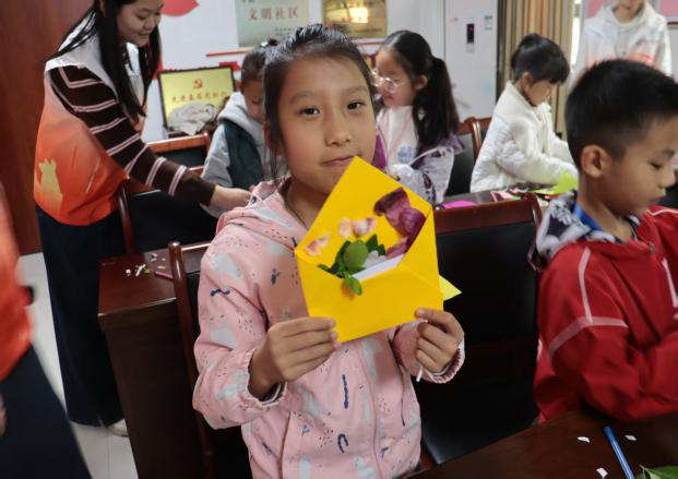 欢声笑语萦绕整个活动现场,旧信封改造、落叶拼贴、花瓣拓印等技法轮番上演,经过小朋友们的精心创作,一个个色彩鲜亮、创意十足的手工信封悉数完成。孩子们高举自己的作品兴奋地展示,脸上洋溢着满满的成就感与喜悦。不少孩子迫不及待地说,要将亲手制作的信封送给家人和朋友,用它装载小纸条传递最真挚的祝福。