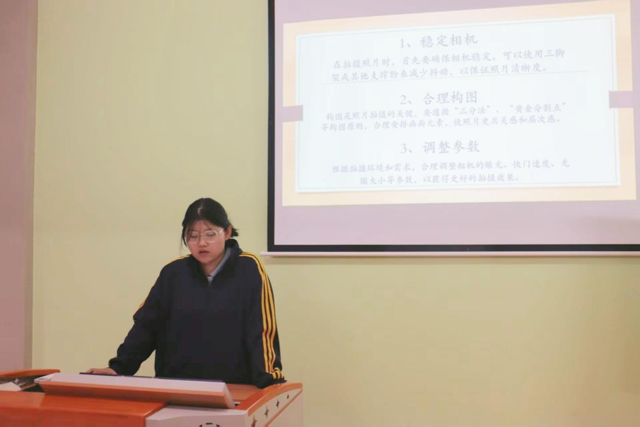 培训伊始,主讲人朱晓婧以“摄影是校园新闻的视觉语言”为核心切入点,系统讲解了摄影基础拍摄技巧。她着重强调,稳定相机是拍出清晰照片的首要前提,可借助三脚架或其他支撑物减少拍摄抖动;构图需遵循“三分法”“黄金分割点”等经典原则,合理排布画面元素,让照片更具层次感与美感;同时,要根据不同拍摄场景灵活调整曝光、快门速度、光圈大小等参数,以达到最佳拍摄效果。