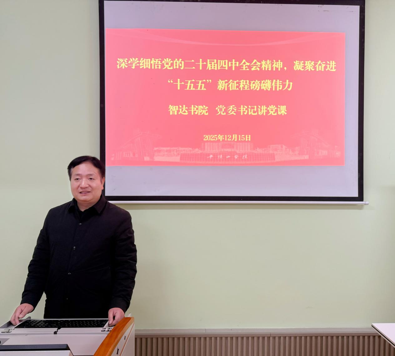 为深入学习贯彻党的二十届四中全会精神,12月15日下午,智达书院党委书记贺国旭以《深学细悟会议精髓,勇担智达育人使命——凝聚奋进“十五五”新征程磅礴伟力》为题讲授专题党课,系统宣讲党的二十届四中全会精神,书院全体师生现场聆听。