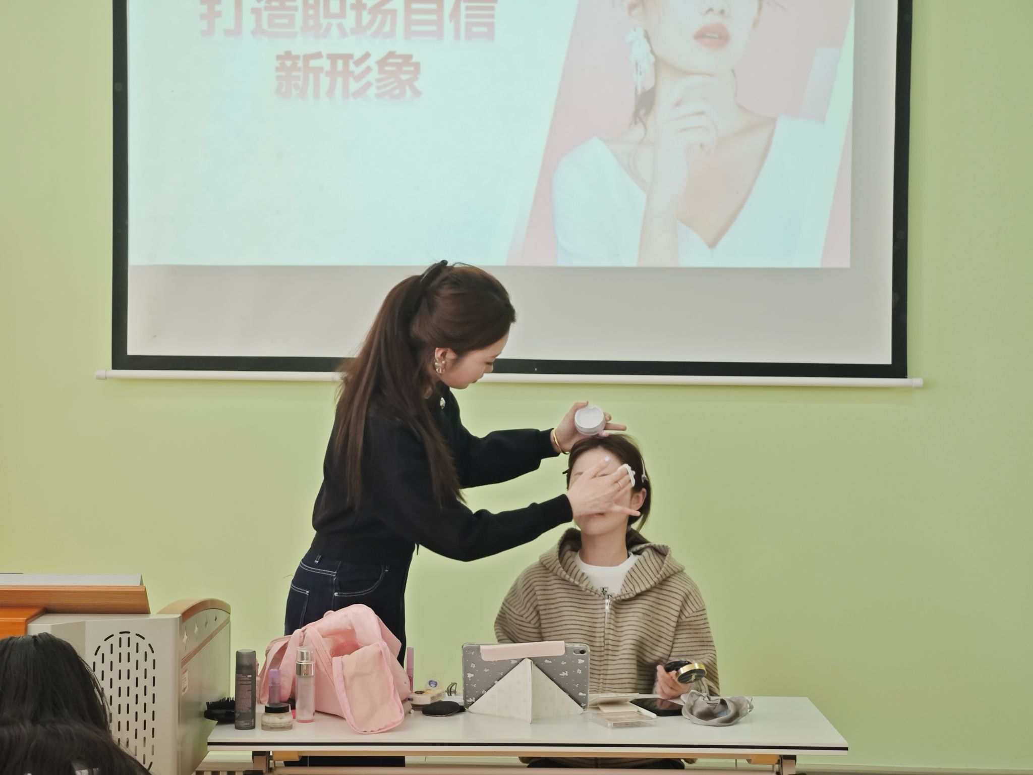“化妆不是伪装,而是告诉面试官——我准备好了。” 活动一开始,高佳佳便打破了同学们对职场妆容的普遍误解。她指出,得体妆容并非制造颜值焦虑,而是求职路上不可忽视的软实力。它既是对机会的尊重,也能展现个人专业、自信的风采。