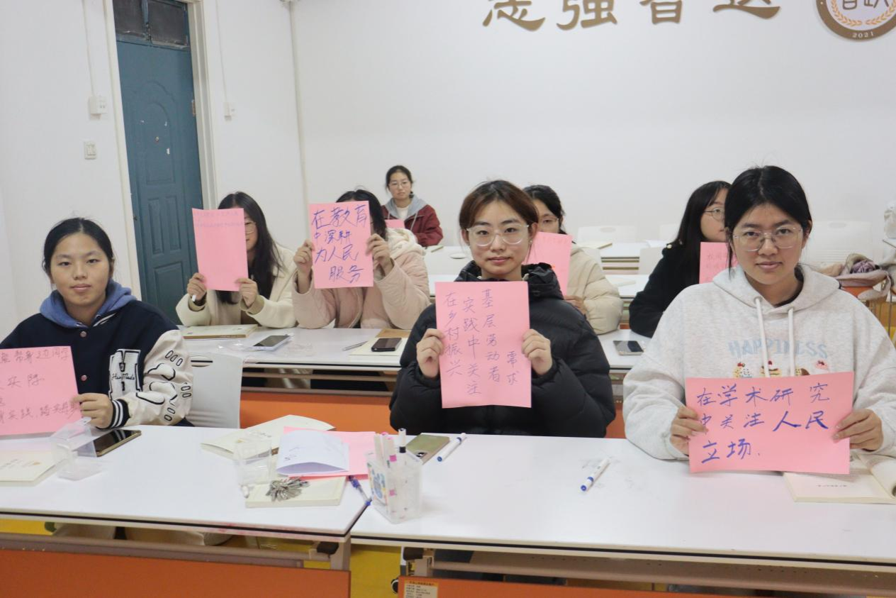 活动接近尾声,“初心践行卡”环节如期开展。学生们拿起笔,在卡片上认真写下自己的行动承诺:“在乡村振兴实践中关注基层劳动者需求”“用专业知识为弱势群体提供法律援助”“在学术研究中坚持人民立场”……一张张字迹工整的卡片,承载着青年学生对经典的认同,更彰显着他们践行真理的决心。